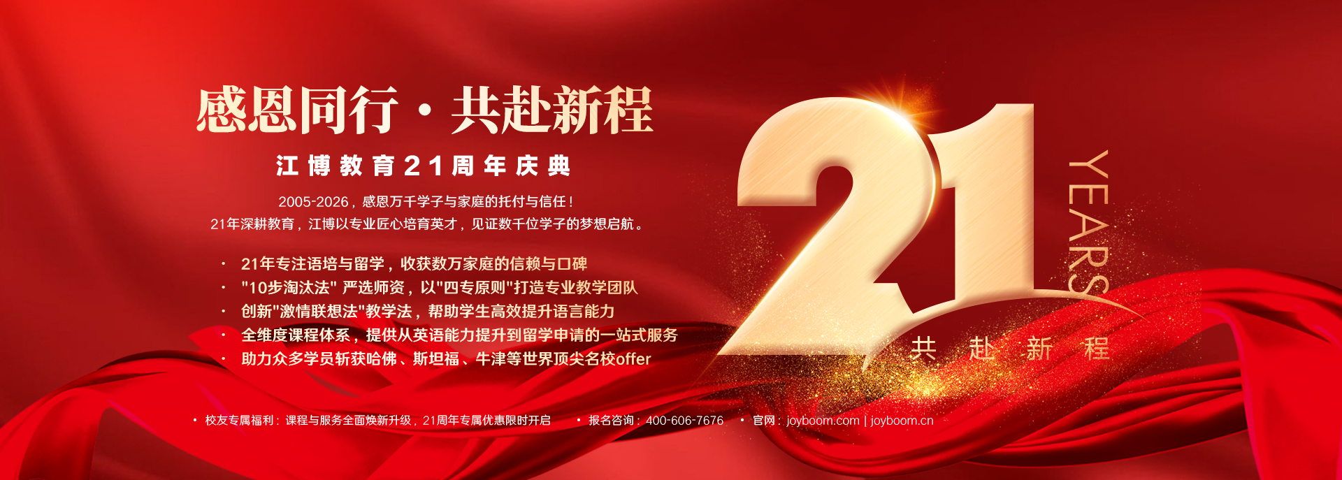 江博教育由原新东方集团董事、北京新东方常务校长江博老师创立于2005年,专注于做从青少年教育、英语能力、出国考试培训到出国留学一站式全闭环高品质教育,成立以来已帮助众多学员收获满意成绩,拿到心仪梦校录取。 二十年来,江博教育严格10步淘汰法遴选人才,坚持用人四专(专注、专心、专业、专精)原则,由总裁亲率教研团队严选懂教育、爱学生、专业强、能力优的好老师组成优师团队和辅导跟踪团队。教师团队以“激情联想阶梯式”教学法为基点,精研多样化个性化课程,培养孩子的学习能力,定制个性化的学习方案,让每一课成就人生每一刻。 江博教育提供全体系课程、英语能力、原版阅读、新概念、托福、雅思、SAT考试培训以及留学申请服务,为学员的学习力赋能,给学生的结果加分,让小课堂创造大价值!