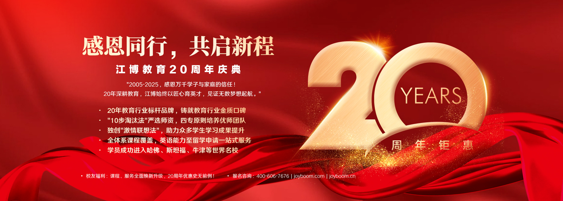 江博教育由原新东方集团董事、北京新东方常务校长江博老师创立于2005年,专注于做从青少年教育、英语能力、出国考试培训到出国留学一站式全闭环高品质教育,成立以来已帮助众多学员收获满意成绩,拿到心仪梦校录取。 二十年来,江博教育严格10步淘汰法遴选人才,坚持用人四专(专注、专心、专业、专精)原则,由总裁亲率教研团队严选懂教育、爱学生、专业强、能力优的好老师组成优师团队和辅导跟踪团队。教师团队以“激情联想阶梯式”教学法为基点,精研多样化个性化课程,培养孩子的学习能力,定制个性化的学习方案,让每一课成就人生每一刻。 江博教育提供全体系课程、英语能力、原版阅读、新概念、托福、雅思、SAT考试培训以及留学申请服务,为学员的学习力赋能,给学生的结果加分,让小课堂创造大价值!