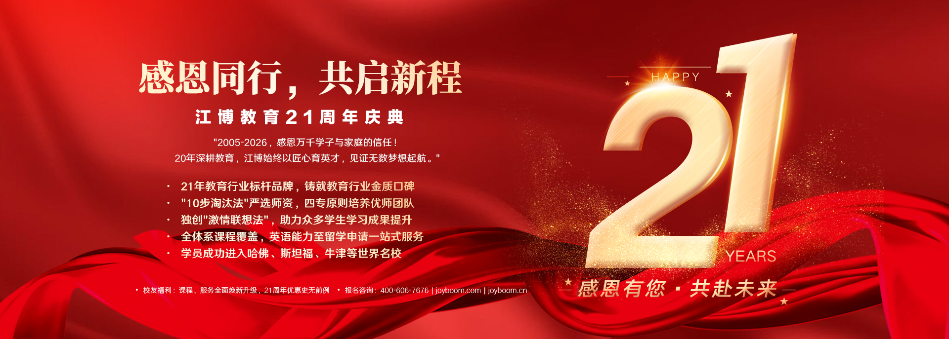 江博教育由原新东方集团董事、北京新东方常务校长江博老师创立于2005年,专注于做从青少年教育、英语能力、出国考试培训到出国留学一站式全闭环高品质教育,成立以来已帮助众多学员收获满意成绩,拿到心仪梦校录取。 二十年来,江博教育严格10步淘汰法遴选人才,坚持用人四专(专注、专心、专业、专精)原则,由总裁亲率教研团队严选懂教育、爱学生、专业强、能力优的好老师组成优师团队和辅导跟踪团队。教师团队以“激情联想阶梯式”教学法为基点,精研多样化个性化课程,培养孩子的学习能力,定制个性化的学习方案,让每一课成就人生每一刻。 江博教育提供全体系课程、英语能力、原版阅读、新概念、托福、雅思、SAT考试培训以及留学申请服务,为学员的学习力赋能,给学生的结果加分,让小课堂创造大价值!